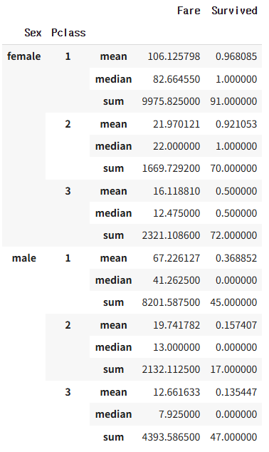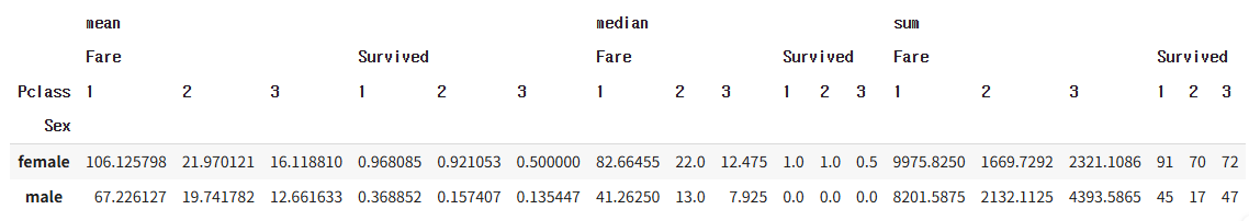 pivot = pd.pivot_table(df, index=['Sex','Pclass'], values=['Survived','Fare'], aggfunc=['mean','median','sum'])