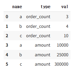 pd.melt(data, id_vars=['name'], var_name='type', value_name='val')