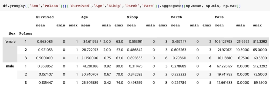 df.groupby(['Sex','Pclass'])[['Survived','Age','SibSp']].aggregate([np.mean, np.min, np.max])