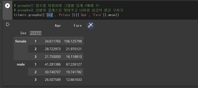 titanic.groupby(["Sex", "Pclass"])[["Age", "Fare"]].mean()