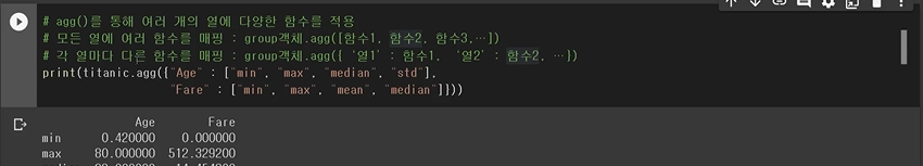 #group객체.agg({"열1":함수1, "열2":함수2,...}) #각 열마다 다른 함수를 매핑