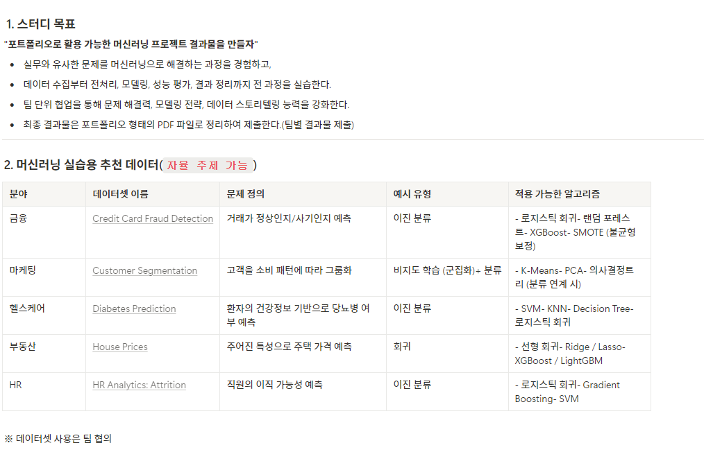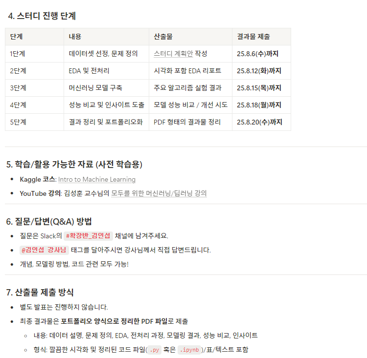 | 1단계 | 데이터셋 선정, 문제 정의 | 스터디 계획안 작성 | 25.8.6(수)까지 |
