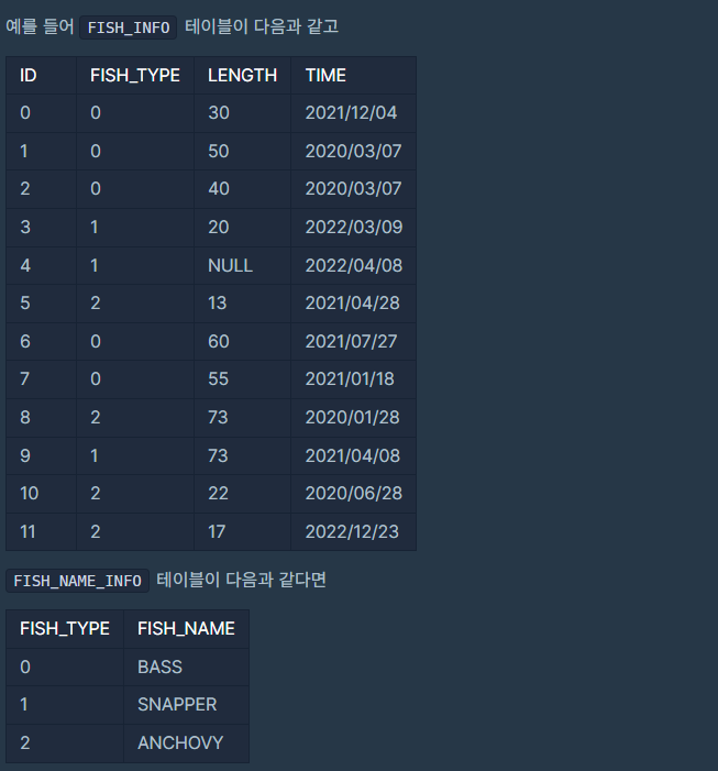 물고기의 ID 컬럼명은 ID, 이름 컬럼명은 FISH_NAME, 길이 컬럼명은 LENGTH로 해주세요.