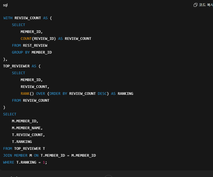 리뷰개수 취합 > 리뷰개수 순서대로 랭킹 매기고 > 랭킹 = 1 뽑고