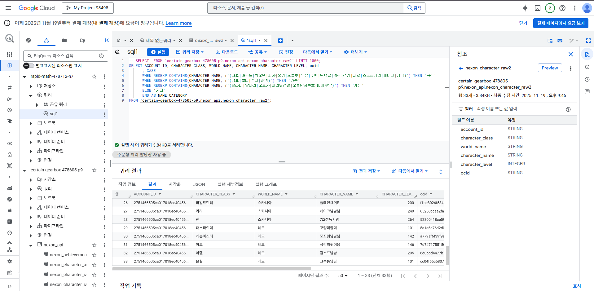 - 시각화 하다보니, 테이블 수정할 거리가 생겼음. 내 캐릭터 이름 분류하기를 해보고 싶어서(ㅋㅋ) 데이터 수정하는 방법을 보다가, 아무래도 BigQuery에서 테이블 자체를 수정하는게 빠르겠다 싶어서 빅쿼리로 고고