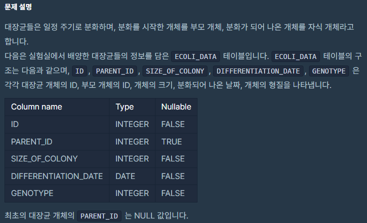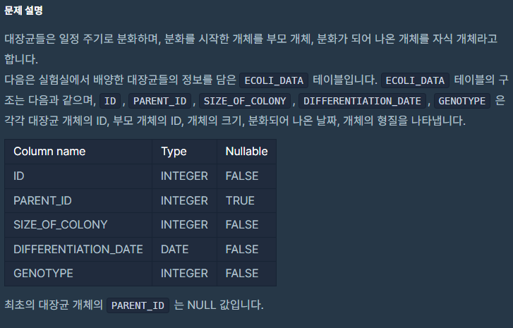 SELECT ID, PARENT_ID, 1 AS GEN FROM ECOLI_DATA WHERE PARENT_ID IS NULL