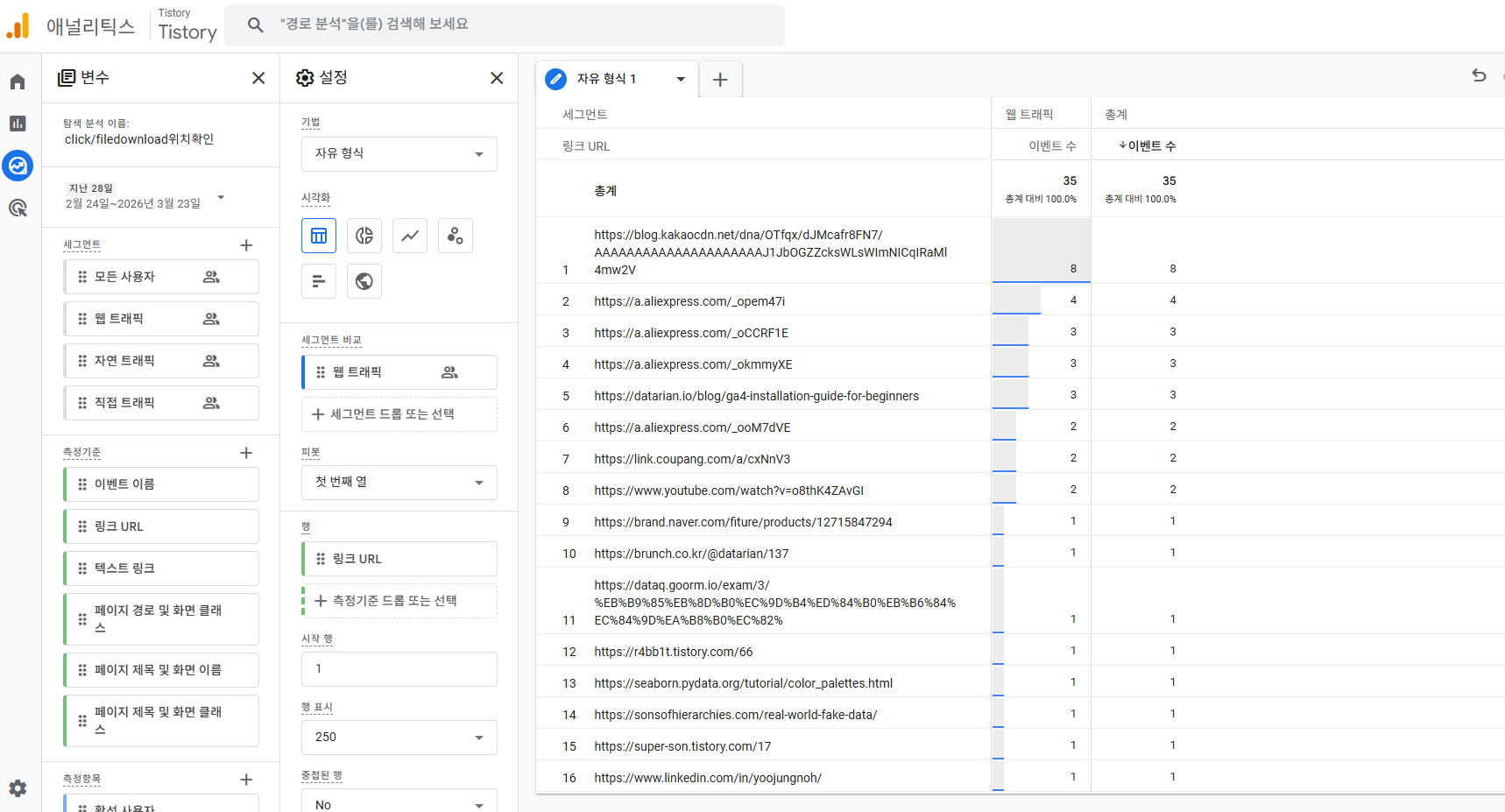 2. 주로 스플릿 키보드 등 제품 후기를 쓰며 물건 추천을 해두었는데, 그와 관련된 링크 클릭이 많았다. 그 외에는 공부자료를 올려놓으며 참조한 외부 사이트 링크를 올려두는데, 그 링크를 클릭한 것도 있었다.