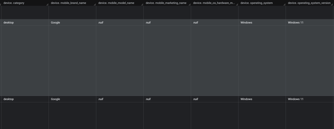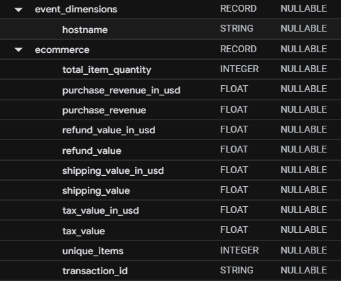event_dimensions, items, ecommerce 는 내가 판매를 하거나 광고를 돌리는게 아니라서 전부 null 값이다.