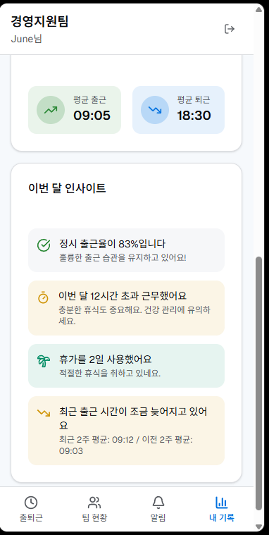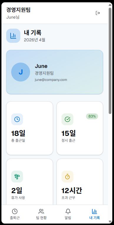 - 핵심 기능: 출퇴근 기록, 외근 관리, 팀 근태 확인, 알림 설정, 개인 근무 통계
