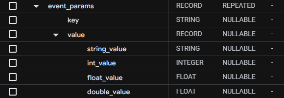 현재 내 데이터는 아래 부분(event_params)만 제외하면 모두 단일 행 데이터이기 때문에, 이 부분만 값을 추출해서 사용하기로 했다.