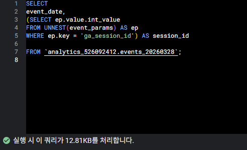 얼마나 데이터를 먹는지 표시해줘서 좋다. 앞에 event_date 추가해도 1kb정도 추가되므로 부담없이 쿼리 ㄱㄱ.